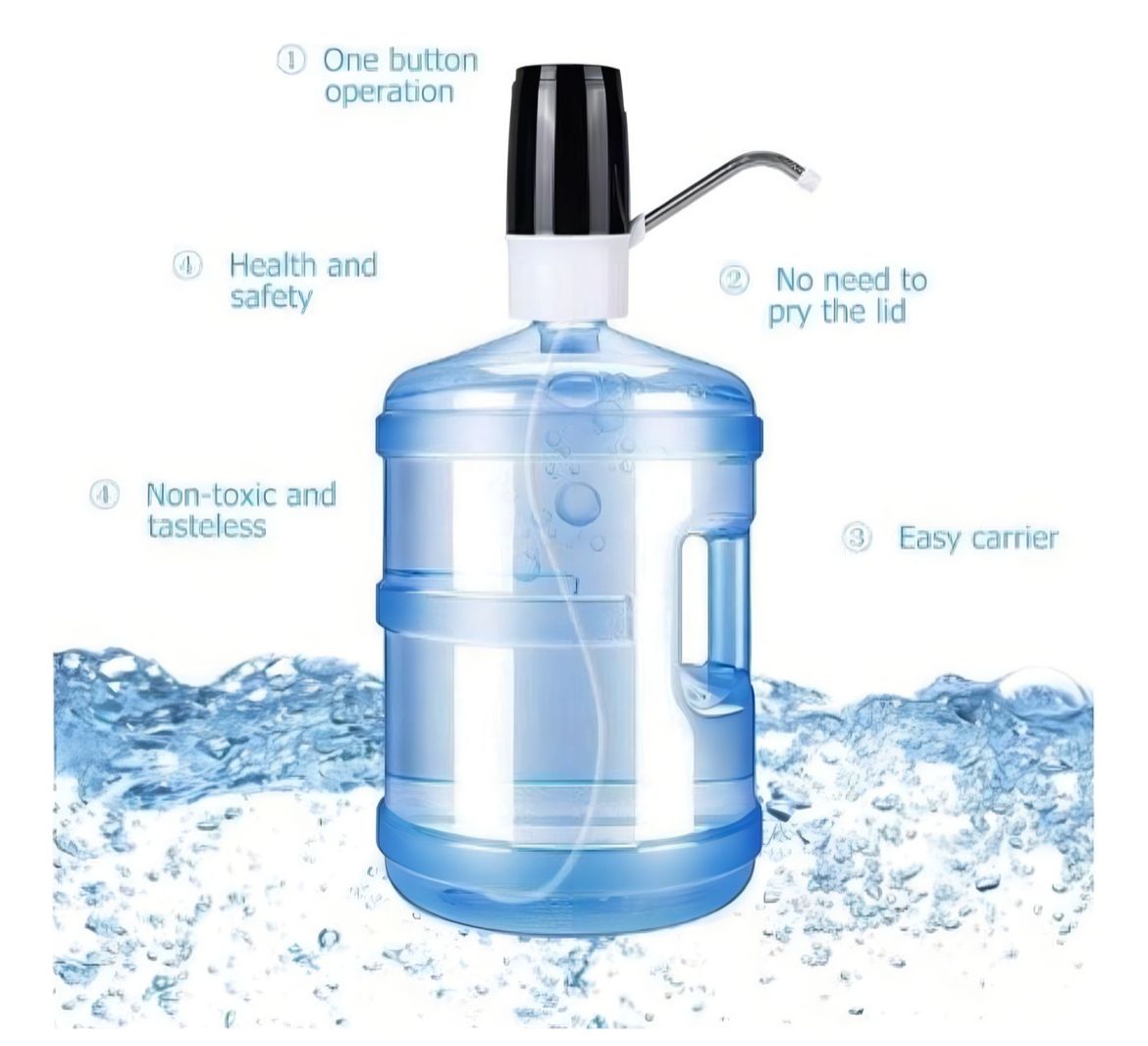 Bomba eléctrica para extraer agua directamente desde el bidón. Ideal para vacaciones, hogares con poco espacio y para personas que tienen dificultades físicas que les impidan manejar dispensadores que requieran esfuerzo con la carga del bidón. Compatible con botellones de hasta 20 litros.